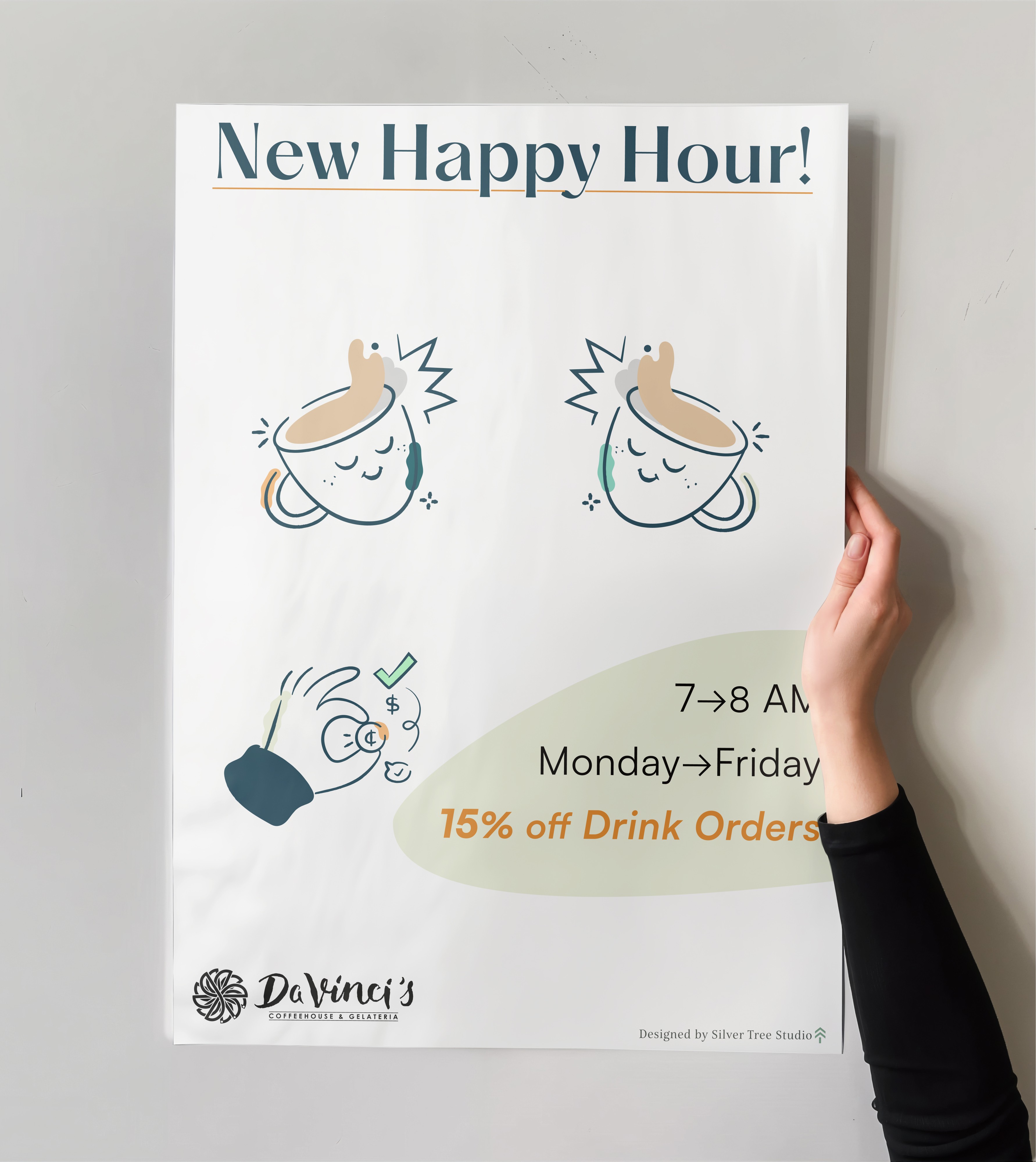 To keep things moving quickly, we only need a few clear inputs up front. Basic measurements or final sizes help ensure everything is designed correctly for print the first time. Brand assets such as your logo, colors, and preferred font style give us the visual foundation to work from. A simple timeframe lets us prioritize and plan delivery, and a short note on the purpose of the design helps guide layout and hierarchy. With those pieces in place, the process stays smooth, fast, and predictable for everyone involved.